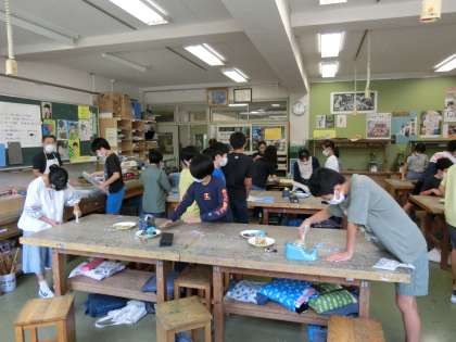 1組、図画工作「多色版画」の学習です。前時に書いた下絵を板に写し、彫り始めました。そのあとは、みんなで協力して、片付けや掃除をします。