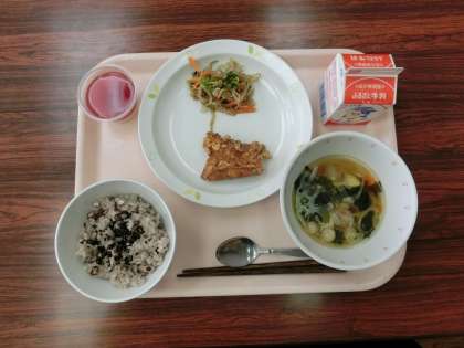 今日の給食は、赤飯・牛乳・鶏肉のからあげ・野菜のごまだれかけ・すまし汁・紅白ゼリーです。
