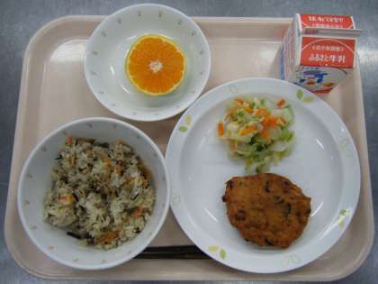 今日の給食は、ひじきごはん・牛乳・手作りさつまあげ・即席漬・くだもの(菊花みかん)です。