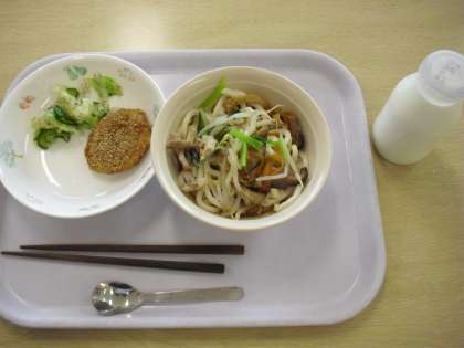 今日の献立は、冷やしうどん、牛乳、ゴマ団子、野菜のゆかりかけです。