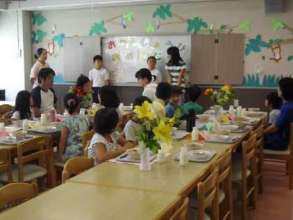 下の画面は、誕生日給食の様子です。メニューのほかにオレンジシャーベットがありました。