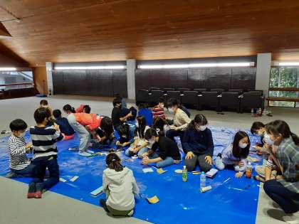 ますのつかみどり体験は、できませんでしたが、川場の間伐材を使って、コースター作りをしています。