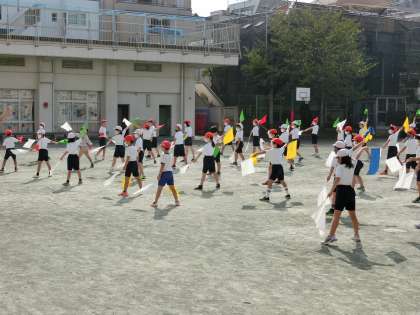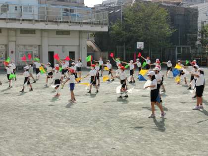 1時間目体育です。色とりどりのフラッグをもって、運動会の表現の練習が始まりました。