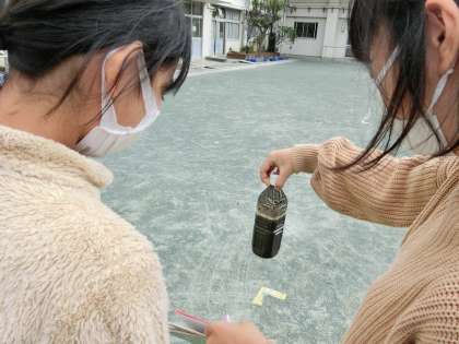 1組理科「大地のつくりと変化」です。火山のはたらきでできた地層は、どのようにしてできたのかを調べるために、ペットボトルに水といろいろな粒の土や砂をいれて実験を行いました。