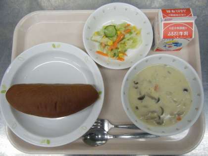 今日の給食は、ココアパン・牛乳・さつま芋シチュー・コーン入りフレンチサラダです。