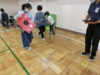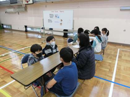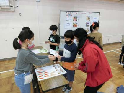 英語で「お料理を作るために、材料のお買いものをする活動」「旅行はどこに行きたくて、何をしたいかを伝える活動」「プログラミングで、光るボールの動きが止まったところから、できた形を伝える活動」を行いました。