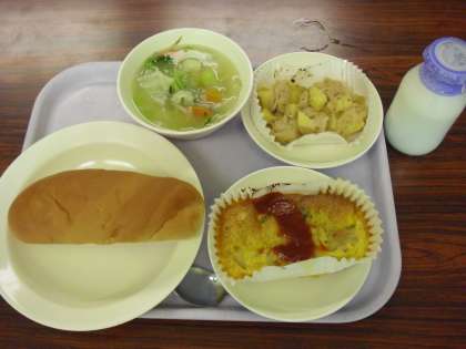 今日の献立は、パン、牛乳、スペイン風オムレツ、ベーコンと野菜のスープ煮です。