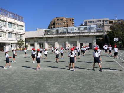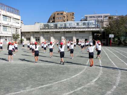 運動会の表現の練習です。今日初めて校庭で行いました。どの子もリズムに乗って、楽しく踊っています。