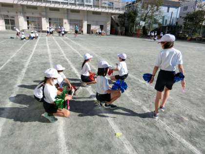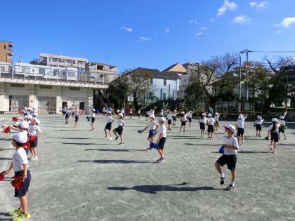 運動会の表現の練習です。軽快なリズムの音楽に乗って、弾んで踊ったり、友達と合わせたりしながら練習しています。