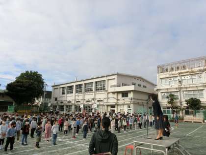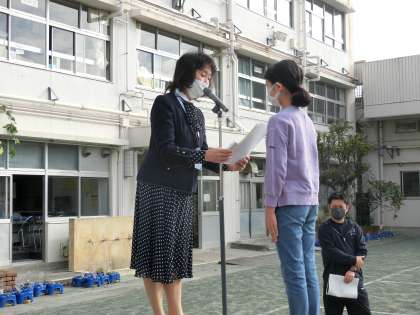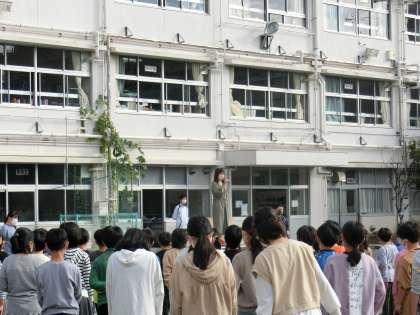 今日、今年度初めて児童朝会を校庭にて行いました。昨年度を含むと1年8か月振りの児童朝会です。1年生と2年生にとっては初めての児童朝会。6年生のあいさつの後、「働く消防の写生会」「新俳句大賞」「税に関する絵葉書コンクール」の表彰を行いました。今回は、今週末の運動会の練習を兼ねて、赤白に分かれて整列し、終了後は、行進して順番に校舎に入りました。5年生6年生の行進は流石というほど、上手でした。少しずつですが平常を取り戻している九品仏小学校です。