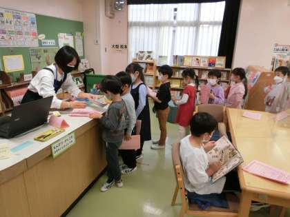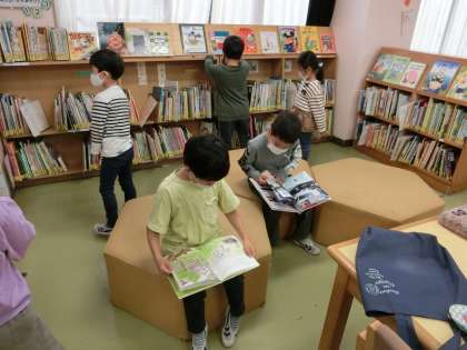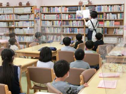 国語(図書)の時間です。司書の方から読み聞かせをしてもらった後は、借りていた本を返却し、次の本を読み始めます。大変静かに、図書の時間を楽しんでいます。