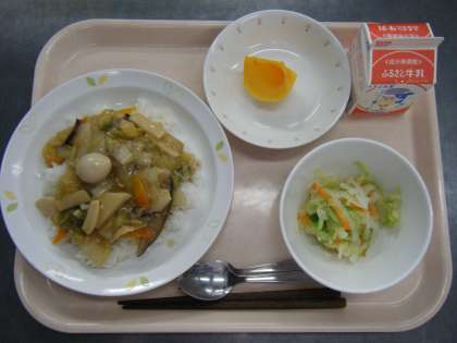 今日の給食は、中華丼・牛乳・きゃべつと大根のサラダ・くだもの(柿)です。