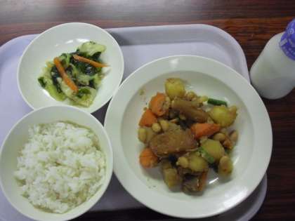 今日の献立は、ご飯、牛乳、豆入り筑前煮、和風サラダです。