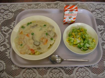 今日のメニューは、ドリア風、みかんジュース、コーン入りフレンチサラダです。