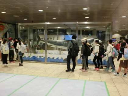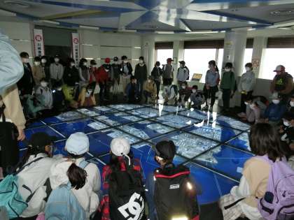 社会科見学に出かけました。最初の見学地は「川崎マリエン」です。ホオジロザメのはく製を見て、その大きさにびっくりしていました。そのあとは、10階の展望室に行きました。