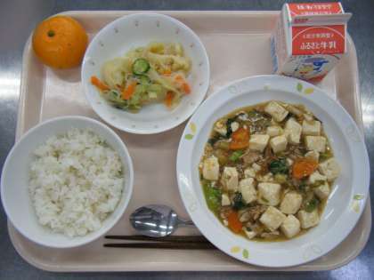 今日の給食は、麦ごはん・牛乳・家常豆腐・春雨サラダ・くだもの(みかん)です。