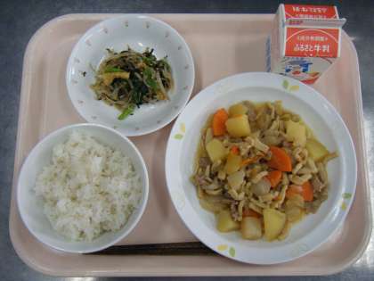 今日の給食は、麦ごはん・牛乳・肉じゃがうま煮・小松菜の乾物あえです。