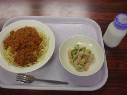 今日の献立は、スパゲティみそソース、牛乳、ビーンズサラダです。