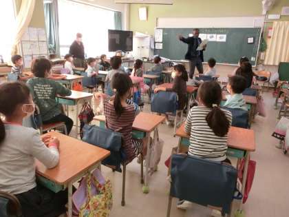 外国語活動「Stationary」の学習です。絵を見て、What's this?と尋ねられ、いろいろな文房具の名前を英語で答える活動をしました。