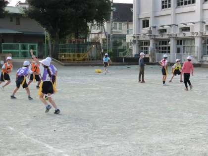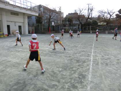 体育「鬼遊び」をおこないました。タグをつけて、相手に取られないようにしながら空いている場所を見付けて、走りました。