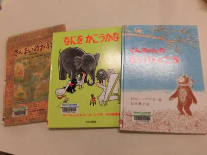 今回のプログラムは、「さんまいのおふだ」の素話「なにを書こうかな」「くんちゃんのだいりょこう」の読み聞かせです。
