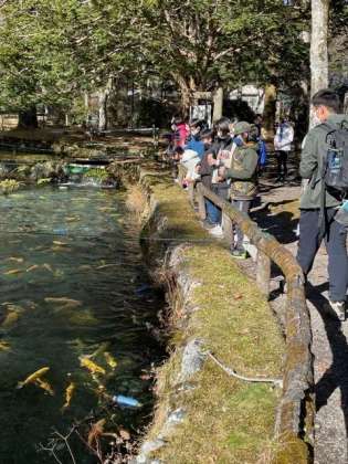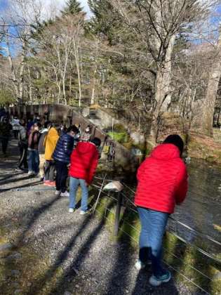 遊覧船が、風が強いとのことで欠航となりました。そのため「さかなと森の観察園」に来ました。ニジマスやレイクトラウトなどに餌やりをし、うれしそうです。