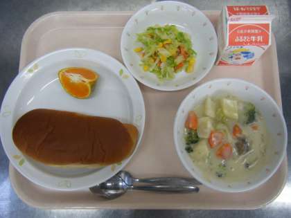 今日の給食は、黒砂糖パン・牛乳・クリームシチュー・コーンサラダ・くだもの(はやか)です。