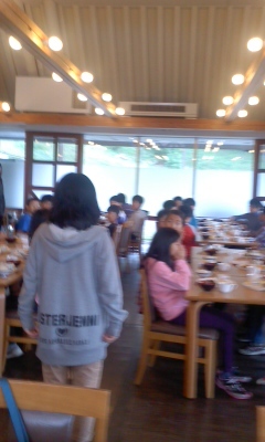 みんな元気です。全員揃っての朝食です。係の子どものいただきますの挨拶の画面です。