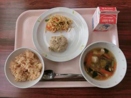 今日の給食は、あけぼのごはん・牛乳・しゅうまい・もやしのコチュジャンかけ・中華スープです。