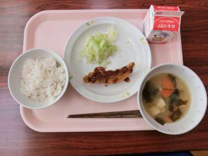 今日の給食は、麦ごはん・牛乳・魚のフライ・ゆできゃべつ・すりごま入りみそ汁です。