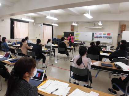 研究授業を終えて、講師の先生から授業の講評をいただき、「児童が主体的にコミュニケーションを図ろうとする授業づくり」について、ご講義いただきました。和やかな雰囲気の中で、演習を交えながら学びました。