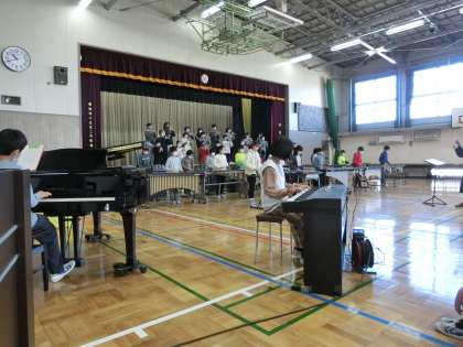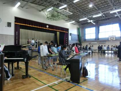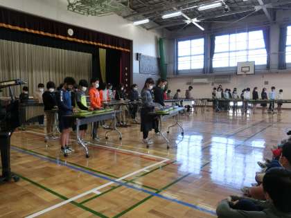 音楽発表会は、ガイドラインに沿って行える範囲で行いました。子どもたちは、学年が一緒になって音楽を作り出す喜びを味わいました。