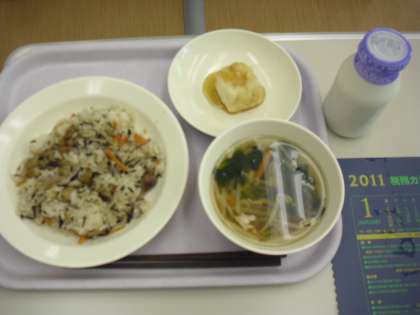 今日の献立は、ひじきご飯、牛乳、沢煮椀、揚げだし豆腐です。