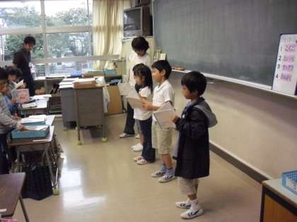 今日も 明るく 元気に 前向きに “朝の詩の音読”をしました。画面は、リーダーのリーダーの子ども達です。特に女の子の声が大きかったです。