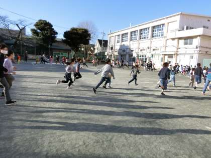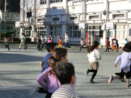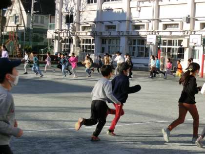 朝のマラソンタイム、第1回目です。走り方の説明を受けた後、自分のペースを決めて元気に走りました。