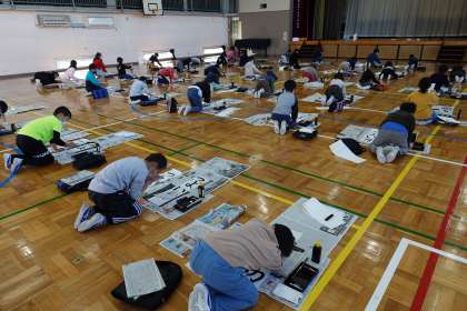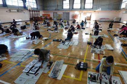 体育館で書き初めを行いました。初めての毛筆、床で書く経験もまだ少ない子どもたちでしたが、自分で書いた字と真剣に向き合い、集中して取り組んでいました。