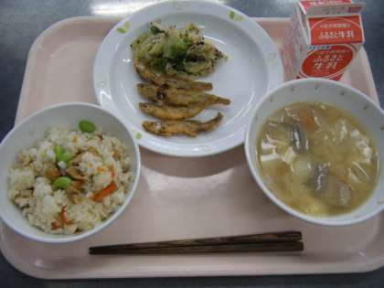 今日の給食は、子ぎつねごはん、牛乳、天ぷら(わかさぎ)、野菜のゆかりかけ、豚汁です。