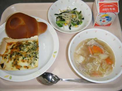 今日の給食は、黒砂糖パン、牛乳、ムサカ(ギリシャ風ラザニア)、田舎風スープ、青菜サラダです。