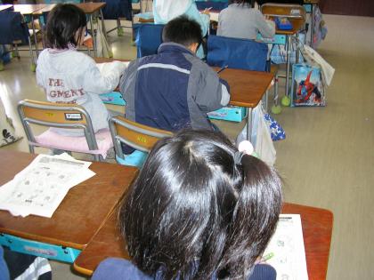 1年生は、朝自習で計算プリントの答え合わせをしています。朝の会の前に落ちつて取り組んでいました。
