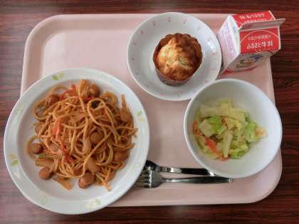 今日の給食は、スパゲティナポリタン、牛乳、きゃべつサラダ、りんごマフィンです。