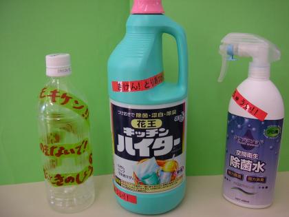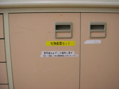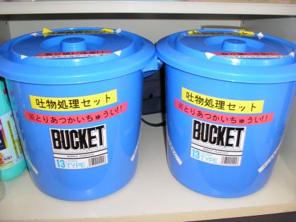 処理に必要なものを保健室の入り口の戸棚に明記し、ポリバケツに一式を入れて、教職員がだれでも処理できるようにしています。左の写真は、戸棚の表示、真ん中は、ポリバケツ一式、そして、左の写真は、処理したあとの消毒(消毒液を薄めて、消毒します。)