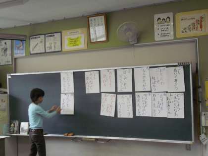 “音楽発表会”の1年生の合唱のときに言うセリフの練習をしていました。気持ちを込めて言える子もいました。黒板にセリフをはっての練習です。
