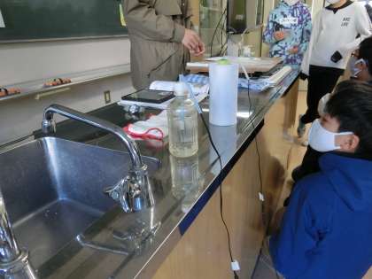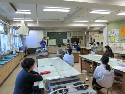 2組家庭「冬を明るく暖かく」です。「健康・快適・安全」及び「持続可能な社会の構築」の視点から、寒い季節を快適に過ごすための衣服の着方や住まい方を学習していきます。今日は、ゲストティーチャーをお迎えして、寒い冬に衣服の着方をどのように工夫したらよいか、実験を通して学習しました。