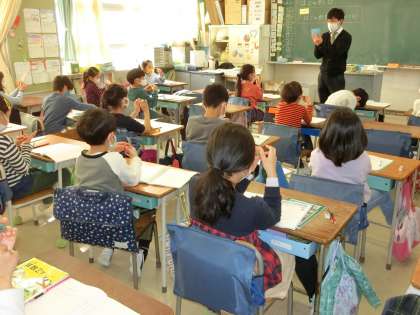 1組国語「おにごっこ」です。これまでの遊びの経験を振り返り、遊びの本を読んで、見付けた遊びを発表しました。この単元で、28日に研究授業を行います。