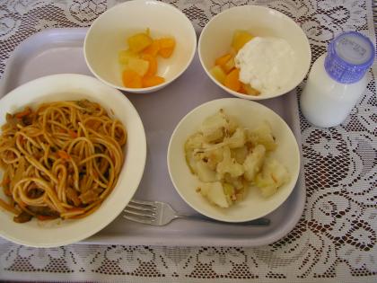 今日のメニューは、スパゲティナポリタン、牛乳、フルーツヨーグルト、ジャーマンポテトです。