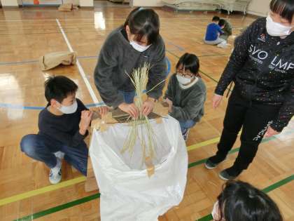 稲穂を刈り取り、はさ掛けのようにして乾燥させましたので、今日はいよいよ脱穀です。昔ながらの農具を使ったり、牛乳の空パックを活用して、牛乳パックの口の中に稲のもみの部分を入れ、口を閉じて手で押さえ稲の茎を引っ張る方法で行ったりしました。