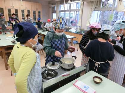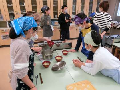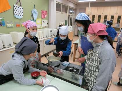 2組家庭「食べて元気 ご飯とみそ汁」の学習です。調理実習を行い、だしを入れていないみそ汁と、だし(煮干し)や具材の入ったみそ汁を飲み比べてみました。子どもたちは、だしのうま味を体感したようです。