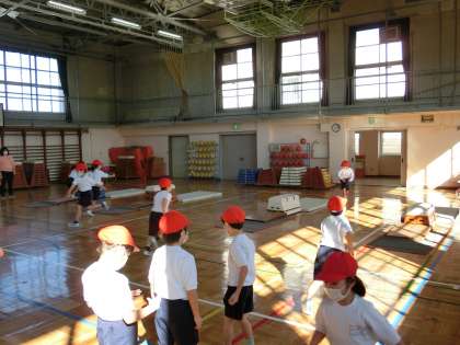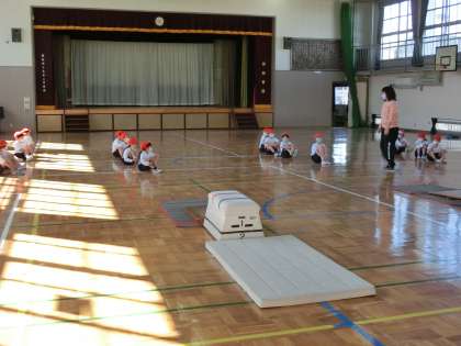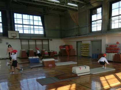 1組体育「跳び箱を使った運動遊び」です。跳び箱の安全な用意の仕方を知り、踏み越し跳びをしました。片足で踏み切って、跳び箱に跳び乗ったり、ジャンプをして跳び下りたりしました。