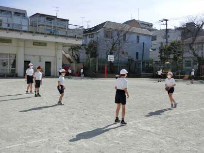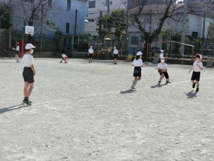 大変よい天気です。体育「ゴール型ゲーム」で、フラッグフットボールの学習です。フラッグフットボールの行い方を知り、ボールを持って走ったり、パスをもらえるように動いたりする練習をしました。