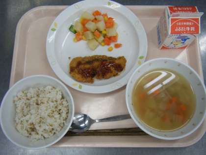 今日の給食は、ごまごはん、牛乳、魚のフライ、マセドアンサラダ・ドレッシング、ベーコン入り野菜スープです。